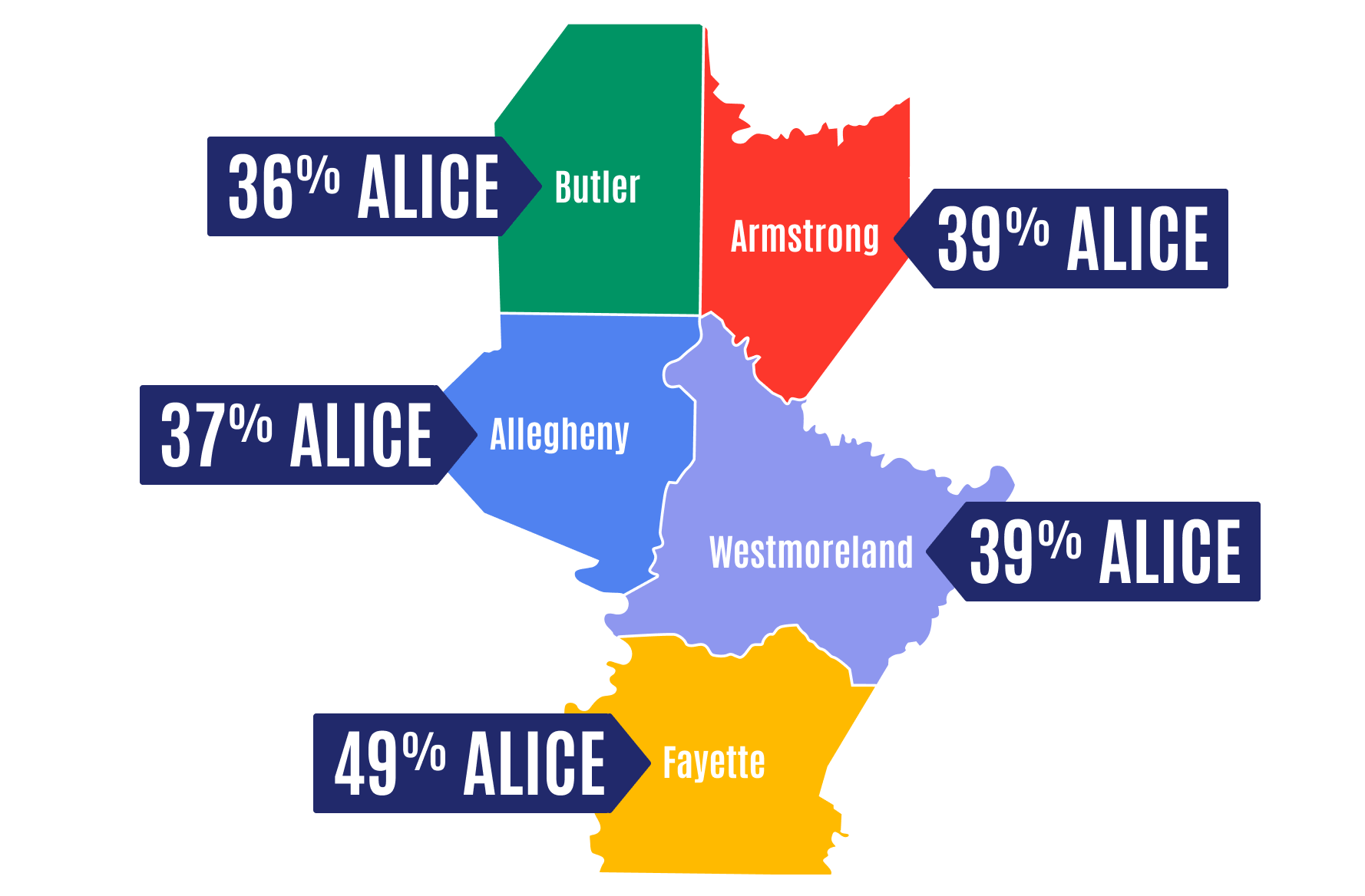 A common belief among many Americans is that if you show up and work hard, you can support your family. The evidence — supported by United Way’s 211 data — shows that, for 38% of households in southwestern Pennsylvania, that is not the case. United Way’s ALICE (Asset Limited, Income Constrained, Employed) data tracks the true costs of meeting basic needs such as housing, transportation, child care, health care and basic technology.